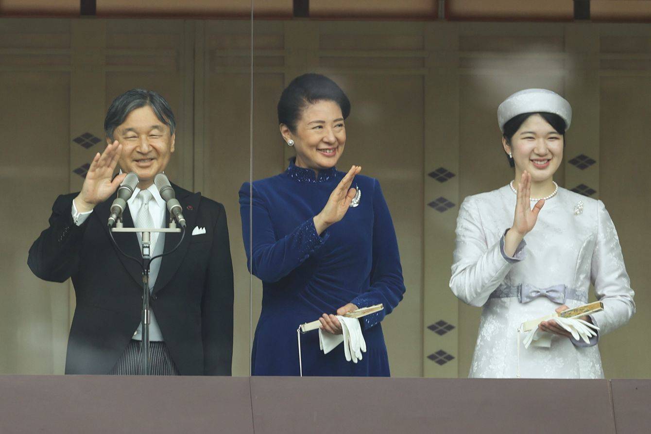 天皇陛下の64歳の誕生日を祝う一般参賀で、手を振られる天皇、皇后両陛下と長女愛子さま=2024年2月23日午前、皇居・宮殿
