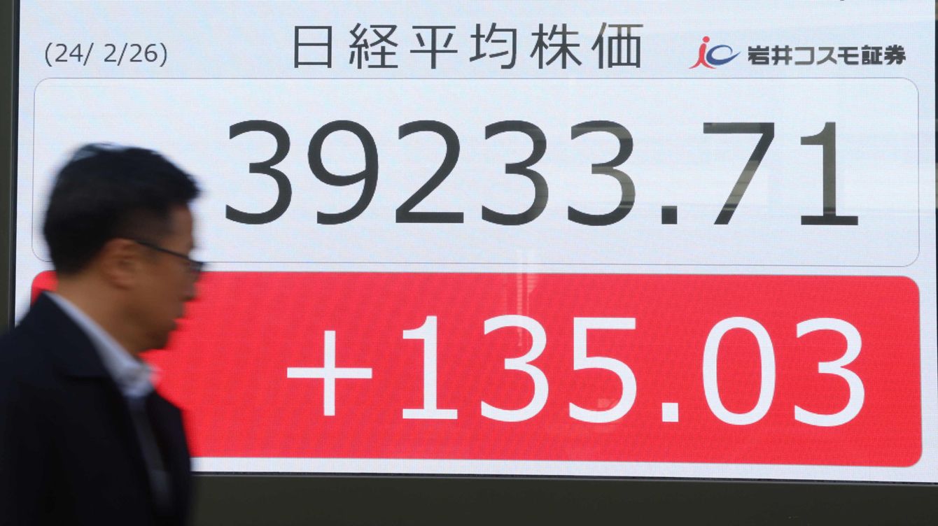 日経平均株価の終値を示すモニター=2024年2月26日午後、東京都中央区