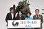 『ゴジラ-1.0』の完成報告記者会見で、写真撮影にポーズを取る(左から)山崎貴監督、俳優の神木隆之介さん、浜辺美波さん、東宝取締役専務執行役員の市川南氏=2023年9月4日、東京都千代田区の帝国ホテル