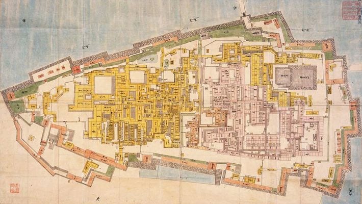 左の黄色の部分が政務を司る場所で、右側の白い部分が大奥。(画像=「