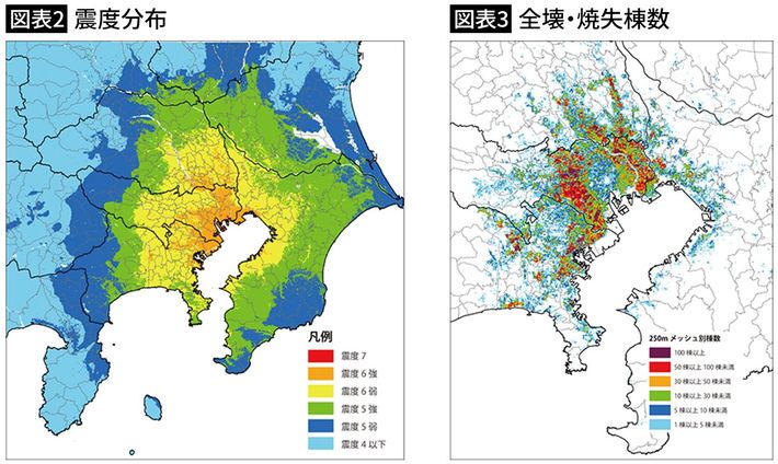 首都直下型地震で想定される震度分布(左)と全壊・焼失棟数〔内閣府「