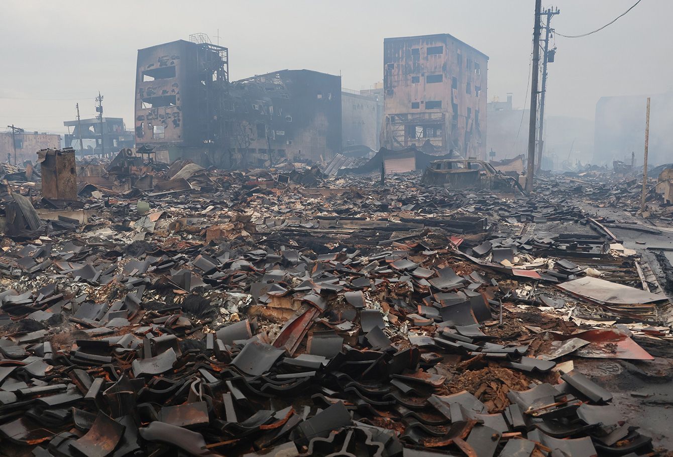 大規模火災で焼け落ちた石川県輪島市の「輪島朝市」付近=2024年1月3日午前