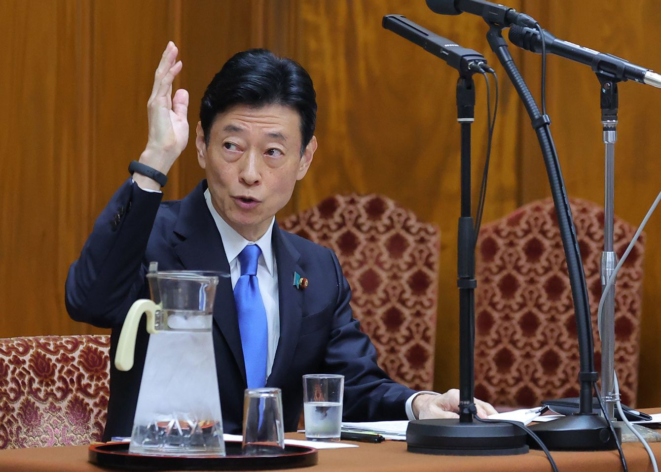 衆院政治倫理審査会で挙手する西村康稔前経済産業相=2024年3月1日、国会内[代表撮影]