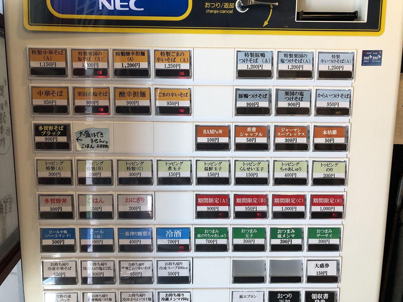 多賀野の店内にある券売機。定番の中華そばや、つけそば、多くのファンを獲得してきた限定ラーメンなどが並ぶ。
