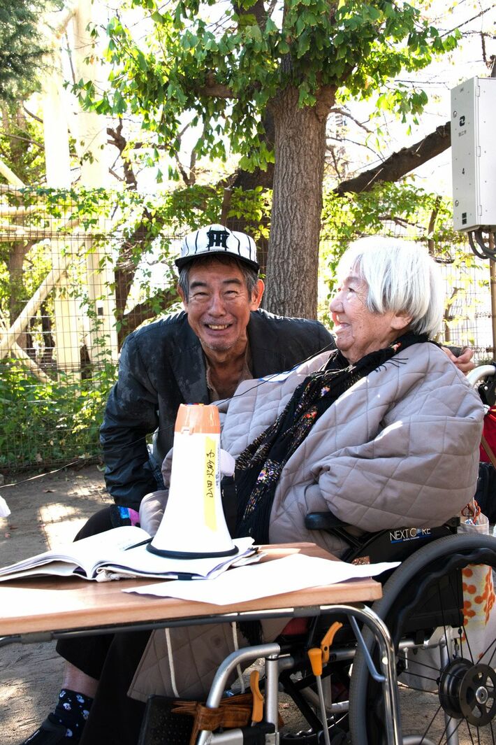 』撮影現場の山田火砂子監督(右)と俳優の小倉蒼蛙さん(左)