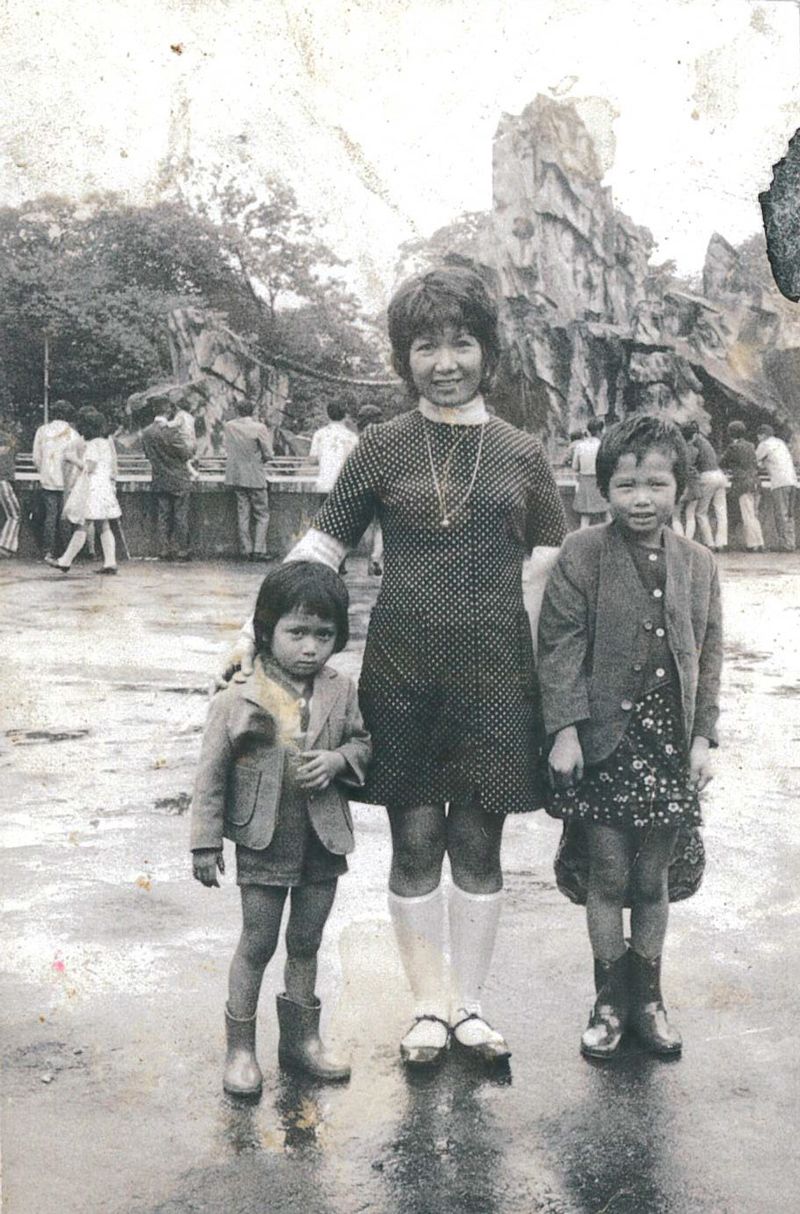 ミニスカートをはく40歳ごろの山田火砂子さん(中央)と、長女の美樹さん(右)、次女(左) 写真提供=現代ぷろだくしょん