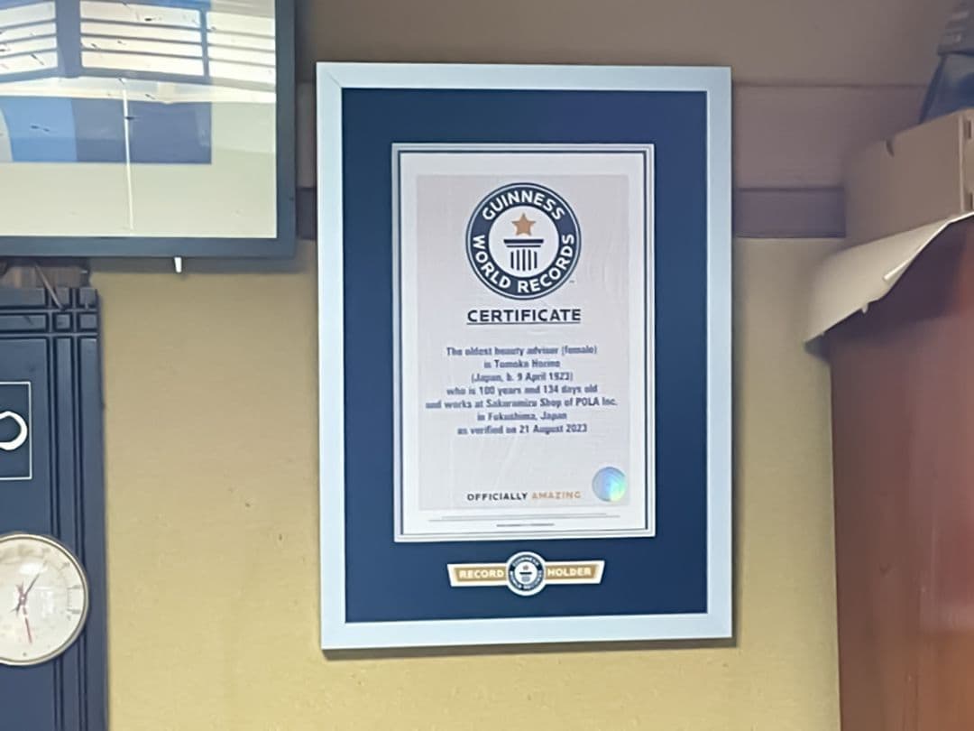 ギネス認定のときに贈呈された表彰状が居間にかけられていた(編集部撮影)