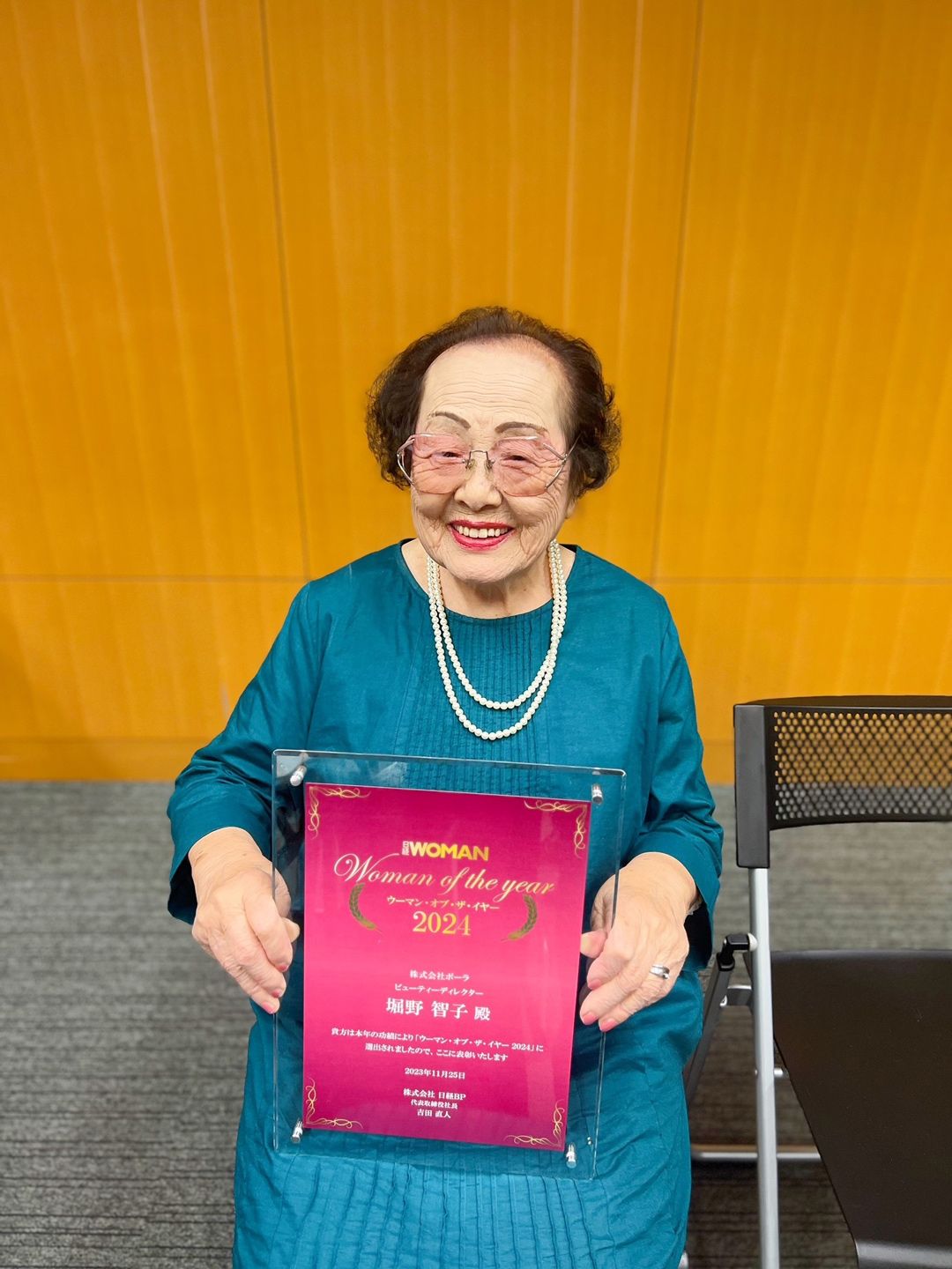 堀野智子さん(100) ポーラ 現役最高齢のビューティーアドバイザー。取材当日もピンクのチークにピンクのネイルが華やかで素敵だった。ピンクがお好きなのだとか。(写真提供=ポーラ)