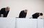 ENEOSホールディングスの斉藤猛社長解任に関し、記者会見で謝罪する社外取締役の西岡清一郎氏(中央)ら=2023年12月19日午後、東京都中央区
