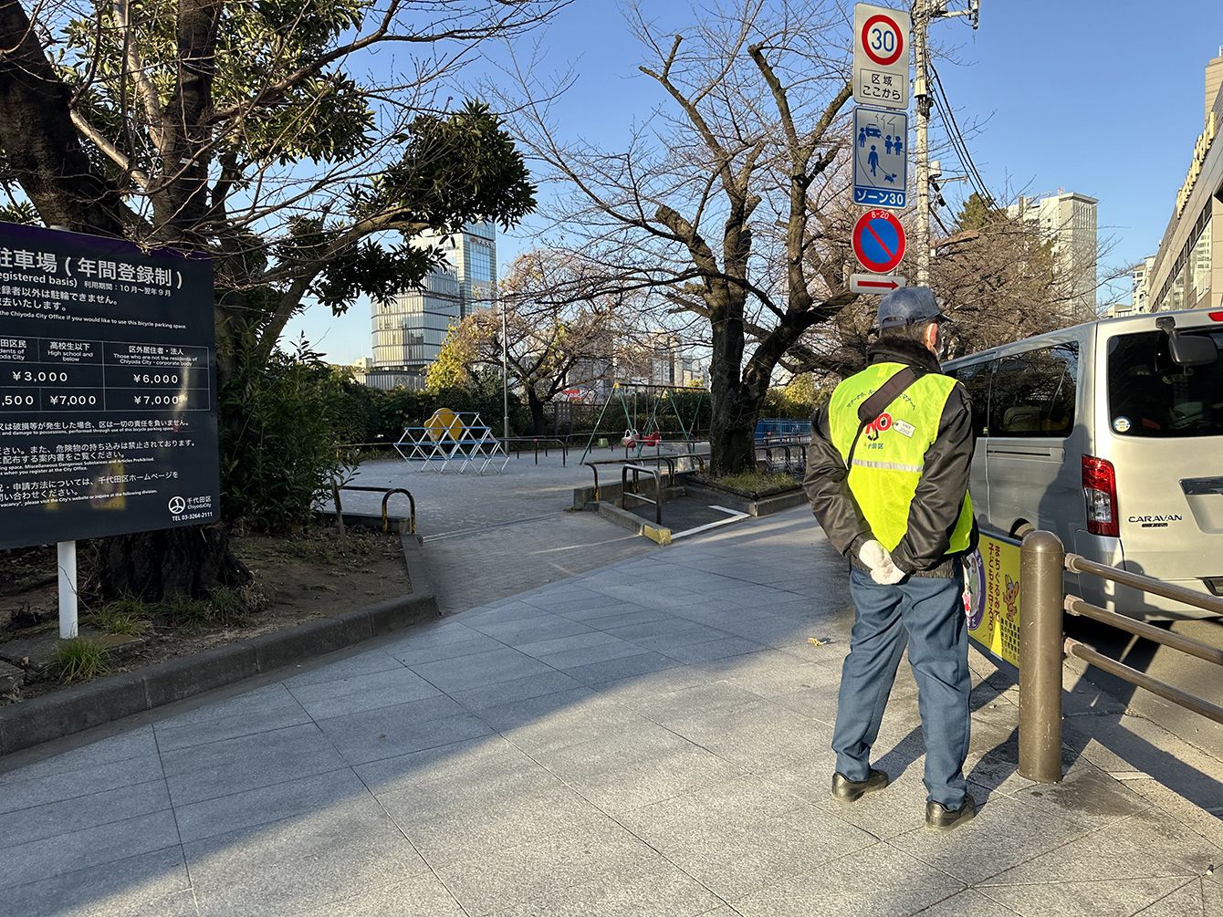 JR市ヶ谷駅前の公園。路上喫煙をする人はいなかった。歩道に立つのは路上喫煙の禁止を呼びかける指導員