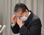 記者会見で涙を拭う岐阜県岐南町の小島英雄町長=2024年2月28日、同町