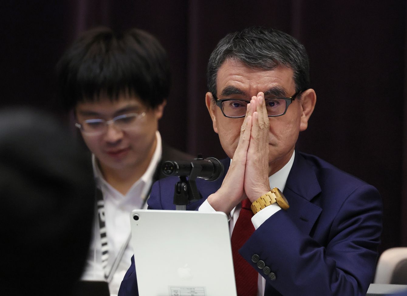 マイナンバー情報総点検に関する関係府省担当課室長説明会に臨む河野太郎デジタル相(右)=2023年6月30日、東京都千代田区