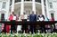 第1期トランプ政権時代の2020年9月15日、前月に発表されたアブラハム合意に基づき、ホワイトハウスで国交正常化合意文書の署名式に臨む(左から)バーレーンのザイヤーニ外相、イスラエルのネタニヤフ首相、トランプ大統領、アラブ首長国連邦(UAE)のアブドラ外相