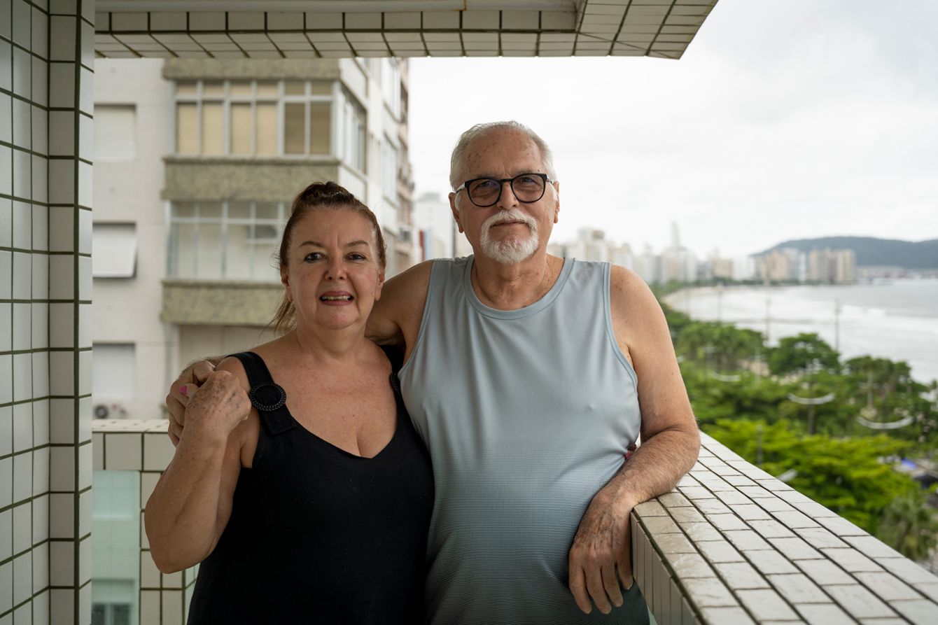 オーシャンビューのベランダでペリン夫妻。後方のマンションも写真右側に傾いている