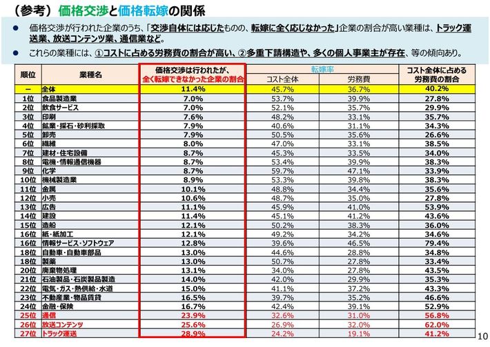価格交渉が⾏われた企業のうち、「交渉⾃体には応じたものの、転嫁に全く応じなかった」企業の割合が⾼い業種は、トラック運送業、放送コンテンツ業、通信業などだった。