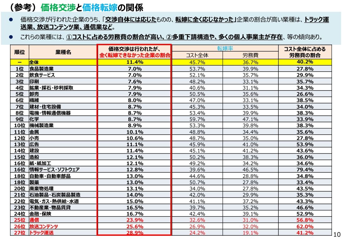 価格交渉が⾏われた企業のうち、「交渉⾃体には応じたものの、転嫁に全く応じなかった」企業の割合が⾼い業種は、トラック運送業、放送コンテンツ業、通信業などだった。