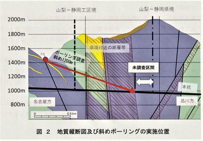 静岡県が問題にしている県境付近の地質縦断図。赤い斜線が断層であり、右の山梨県と左の静岡県の断層が地下深くで、つながる可能性がある(=JR東海の資料)