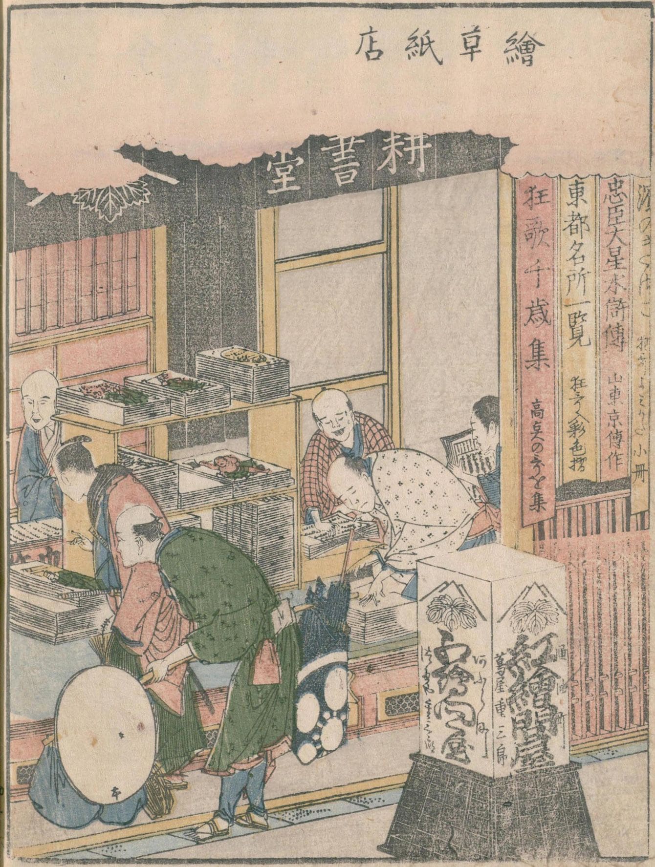 葛飾北斎が描いた蔦屋(書店)の店頭の様子 作=浅草庵、画=葛飾北斎『画本東都遊 3巻』1802年(出典=