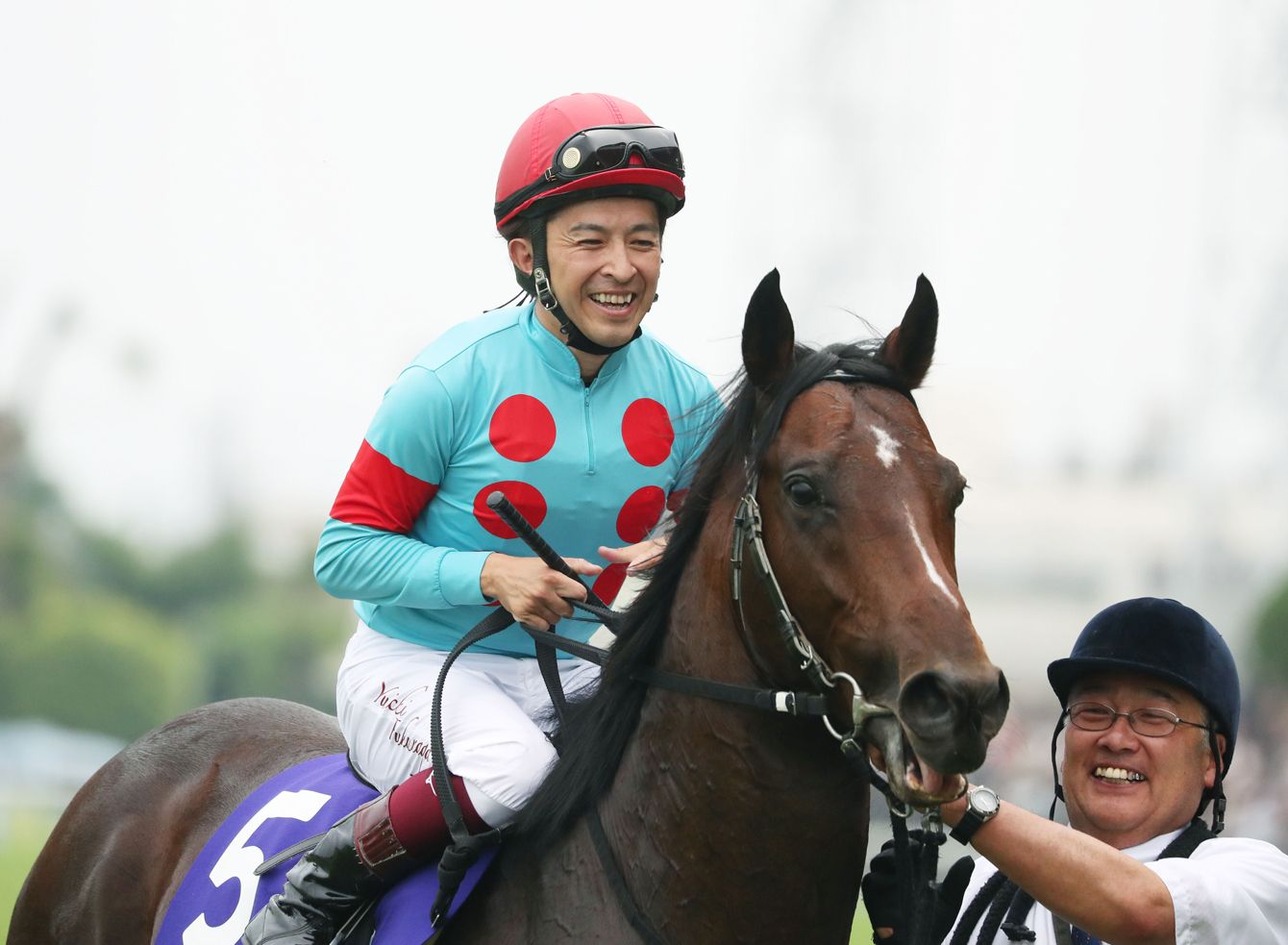 第69回安田記念(GI)を制し、インディチャンプの馬上で笑顔を見せる福永祐一騎手(中央)=2019年6月2日、東京競馬場
