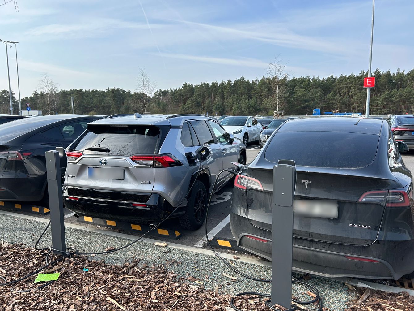 約3000台が収容できる広大な駐車場。多くはテスラ製で、充電スタンドにつながれていた(3月20日)