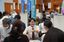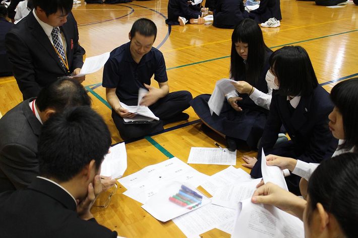 島根県立隠岐島前高等学校の教育会議に参加する岩本氏。高校生と島の未来像について語り合った。