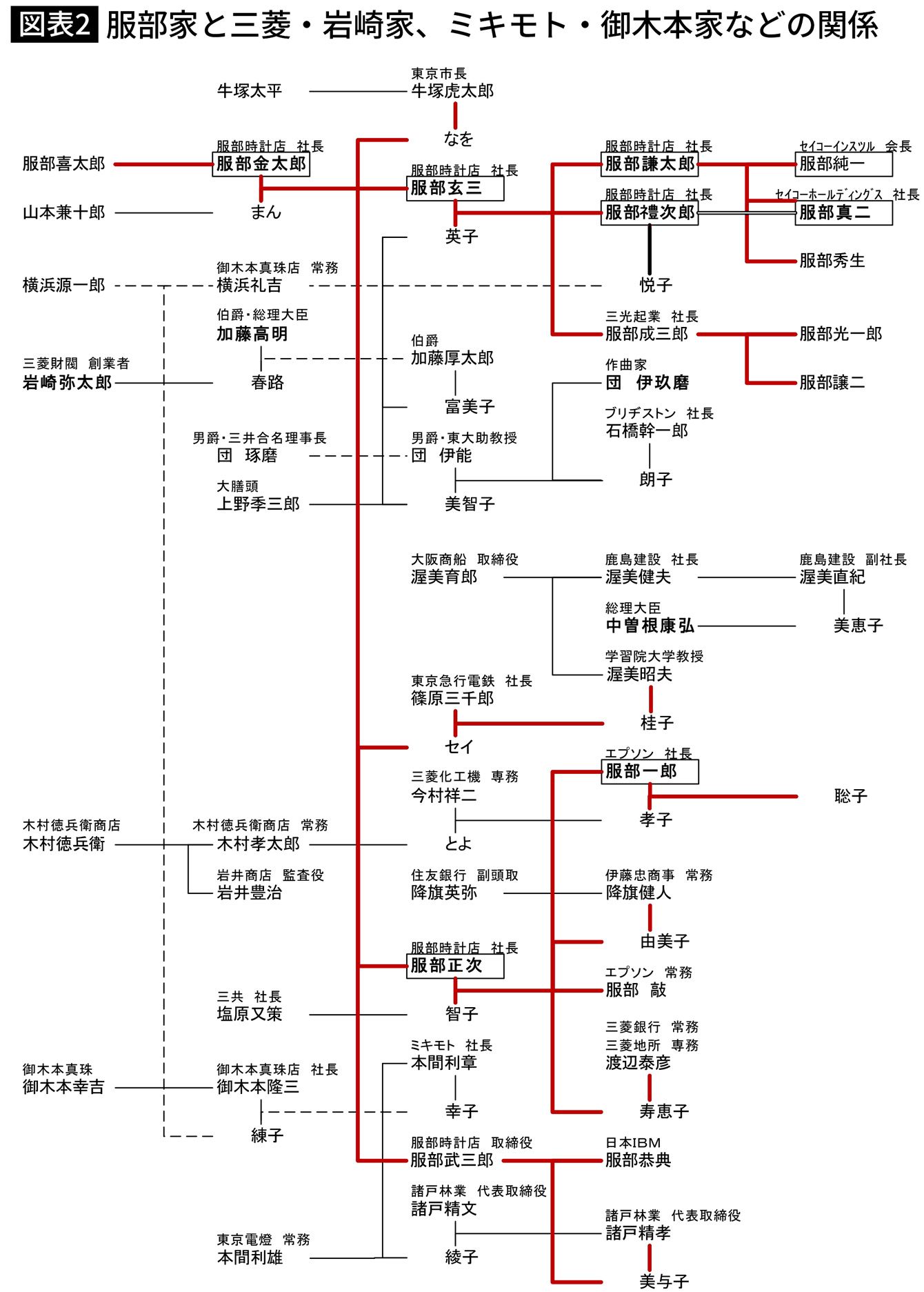服部家と三菱・岩崎家、ミキモト・御木本家などの関係