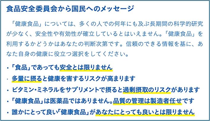 内閣府食品安全委員会は、機能性表示食品制度がスタートした2015年、健康食品に関する報告書をまとめ、注意を呼びかけた(食品安全委員会20周年リーフレットより)