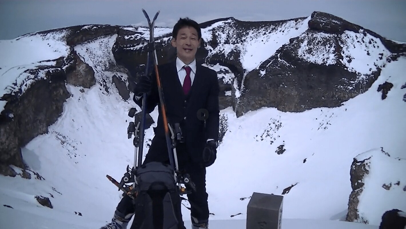 フランスとイタリアの国境にあるヨーロッパ最高峰のモンブラン(標高4810m)。ガイドの指示のもと、風が穏やかになったタイミングでジャンパーを脱ぎ、スーツ姿で動画の撮影に臨んだ