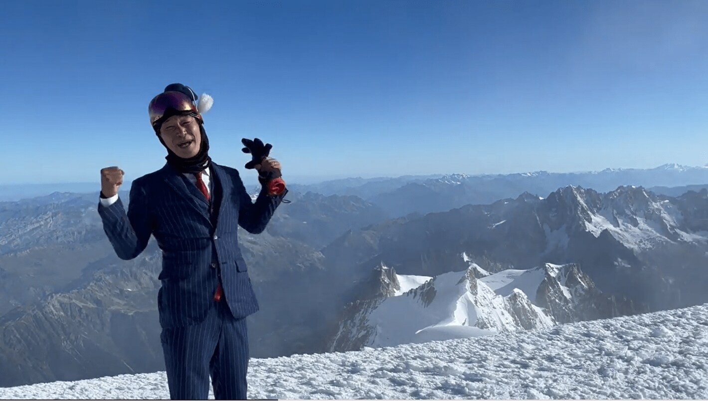 フランスとイタリアの国境にあるヨーロッパ最高峰のモンブラン(標高4810m)。ガイドの指示のもと、風が穏やかになったタイミングでジャンパーを脱ぎ、スーツ姿で動画の撮影に臨んだ