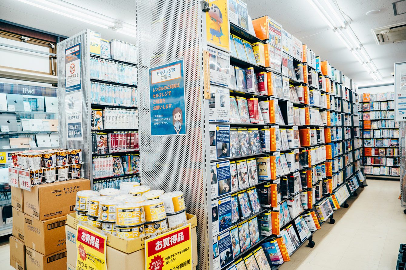 本社近くにあるゲオ大塚駅南口店。棚の手前には懐かしのCD-Rや、DVD鑑賞のお供にポップコーンも売られていた