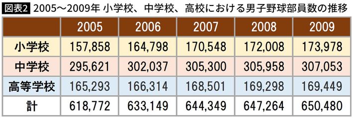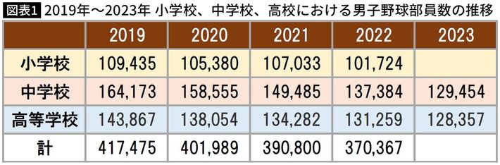 スポーツ少年団学童野球、中体連野球部部活、日本高野連資料より筆者作成