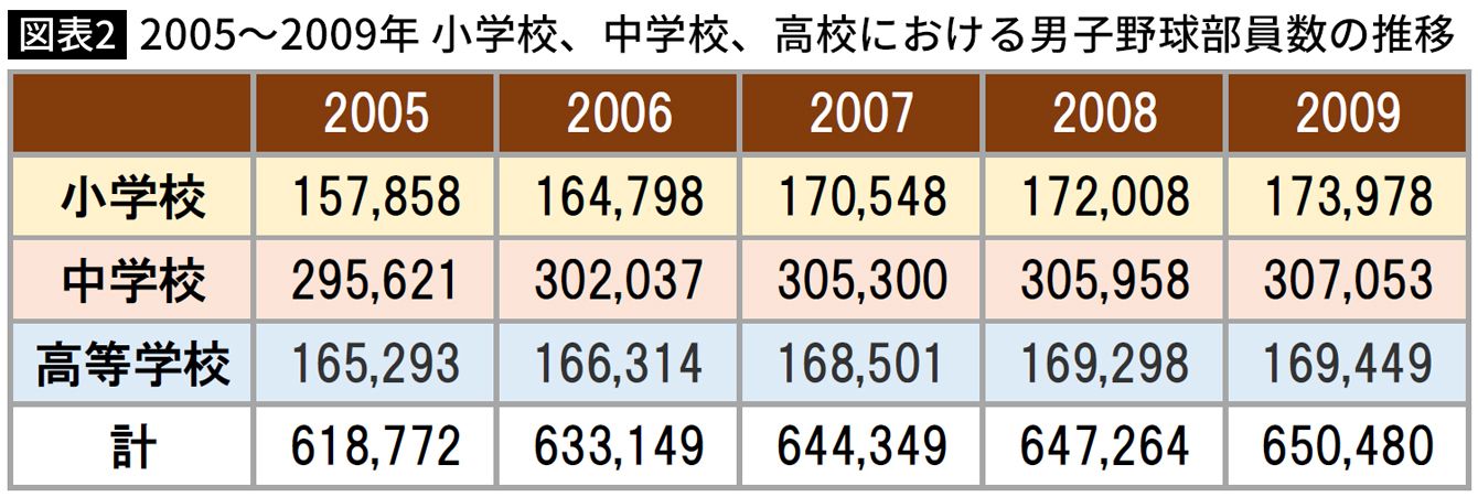 スポーツ少年団学童野球、中体連野球部部活、日本高野連資料より筆者作成