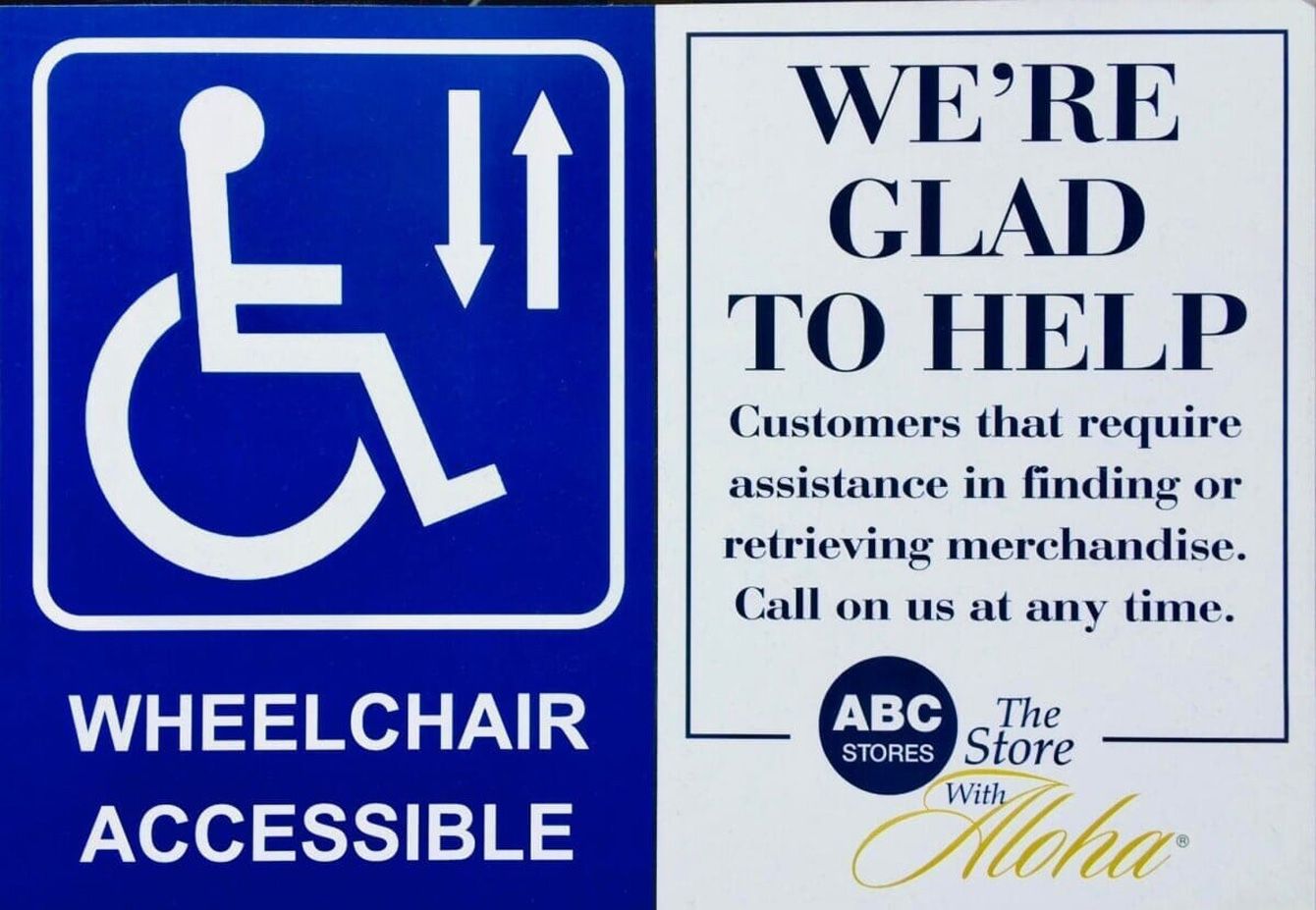 ハワイのハレクラニホテル近くにあるABCストア内に貼られたサイン。5段の階段横の昇降リフトに、車いす利用者を「喜んでお手伝いします」と書かれている