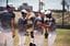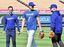 カージナルスとの試合前、キャッチボールを終えて笑顔を見せるドジャースの大谷翔平(中央)=2024年3月29日、アメリカ・ロサンゼルス