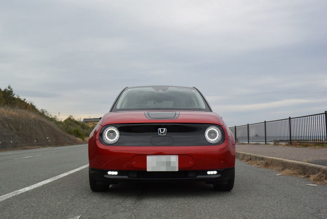 Honda eのフロントビュー。古き良き時代のユーロハッチバックを連想させる凝縮感の強いデザインだ