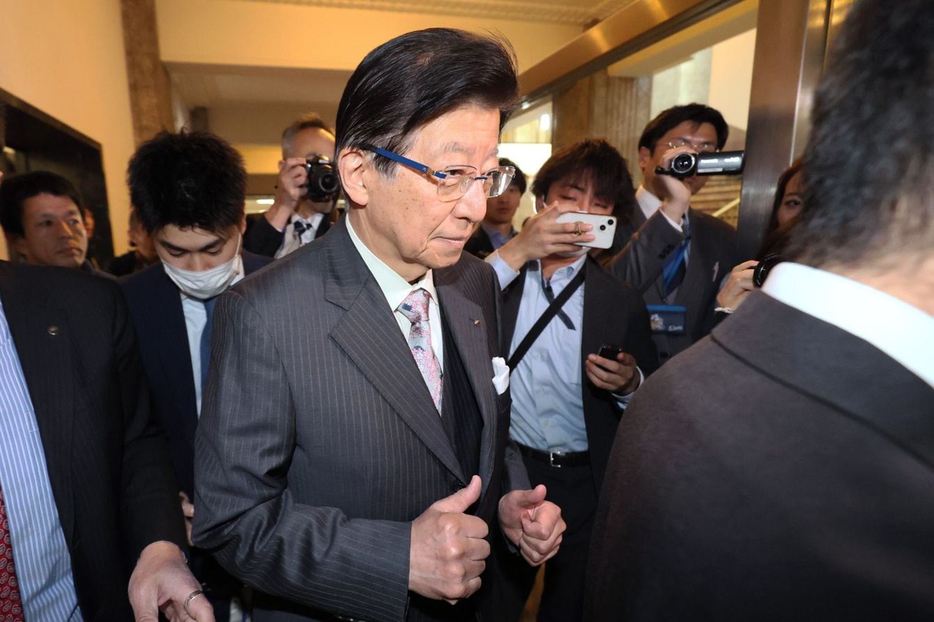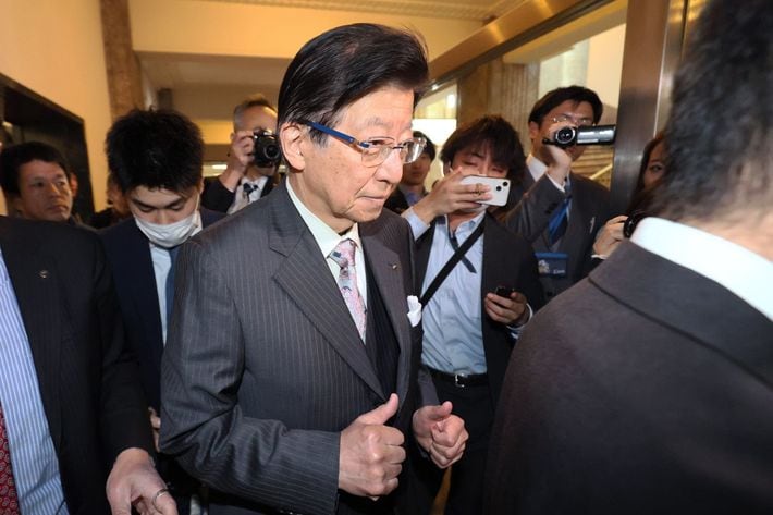 退職届を提出し、報道陣に囲まれながら知事室に向かう静岡県の川勝平太知事(中央)=2024年4月10日午前、静岡市