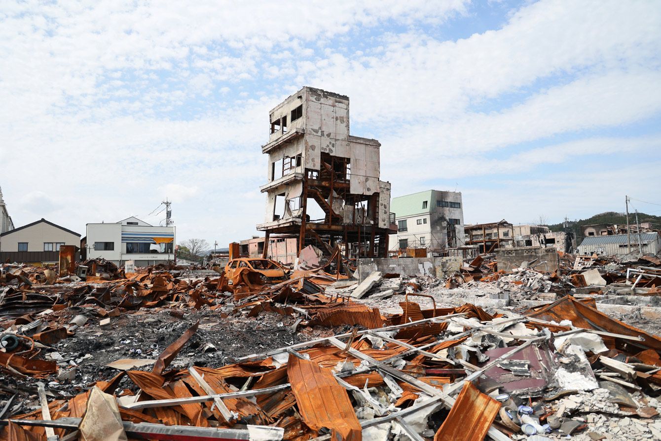 能登半島地震の発生から3カ月を迎えた、大規模な火災が発生した観光名所「朝市通り」周辺=2024年4月1日午前、石川県輪島市