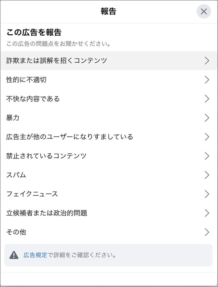 Facebookでは、広告の横にある「…」をクリックすると「広告を報告」→「詐欺または誤解を招くコンテンツ」と表示されるようになった。Instagramでも同様に通報が可能