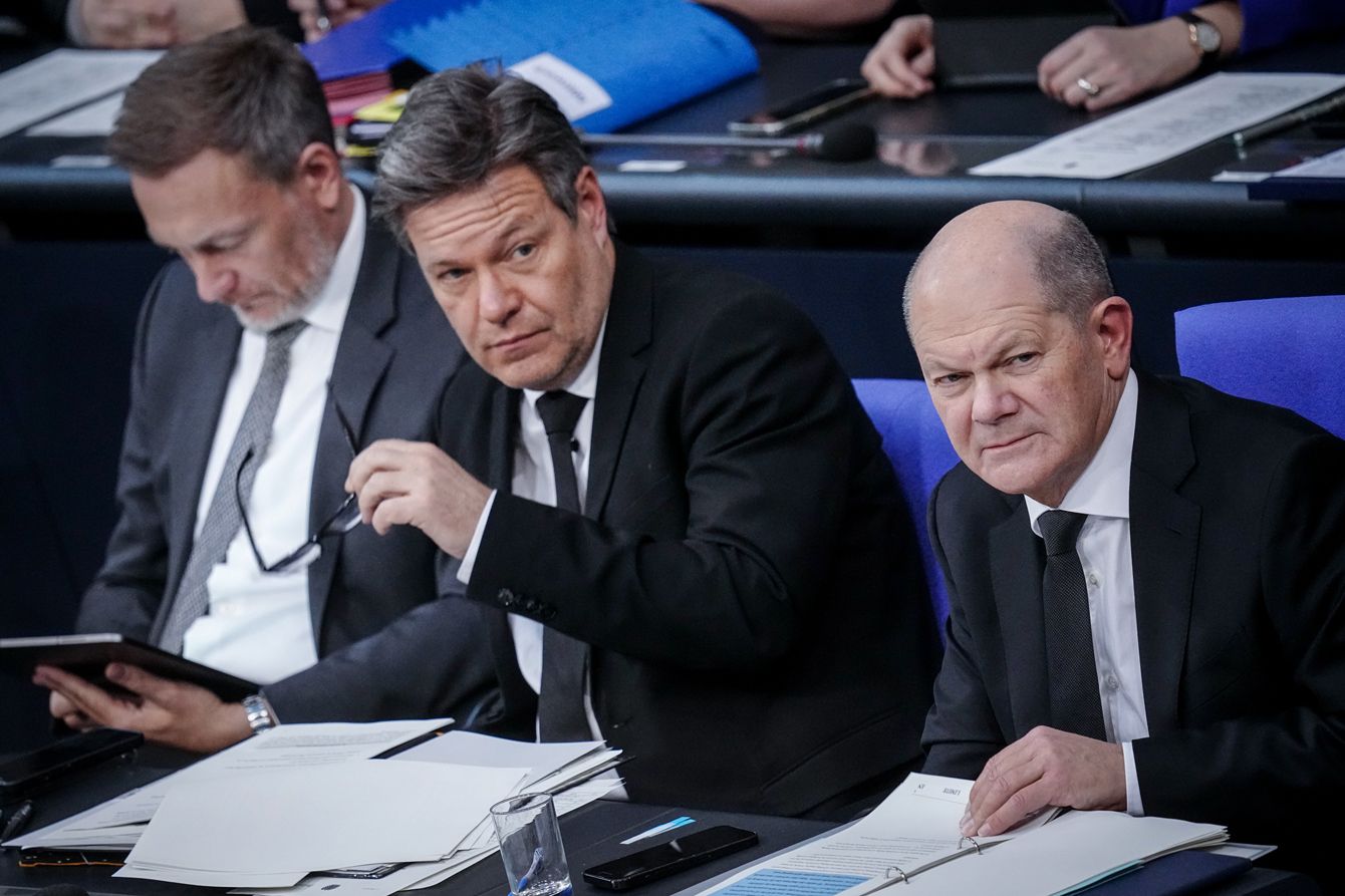 ドイツ連邦議会の予算討論に出席する緑の党のロバート・ハーベック経済・気候保護相(中央)=2024年1月31日、ベルリン