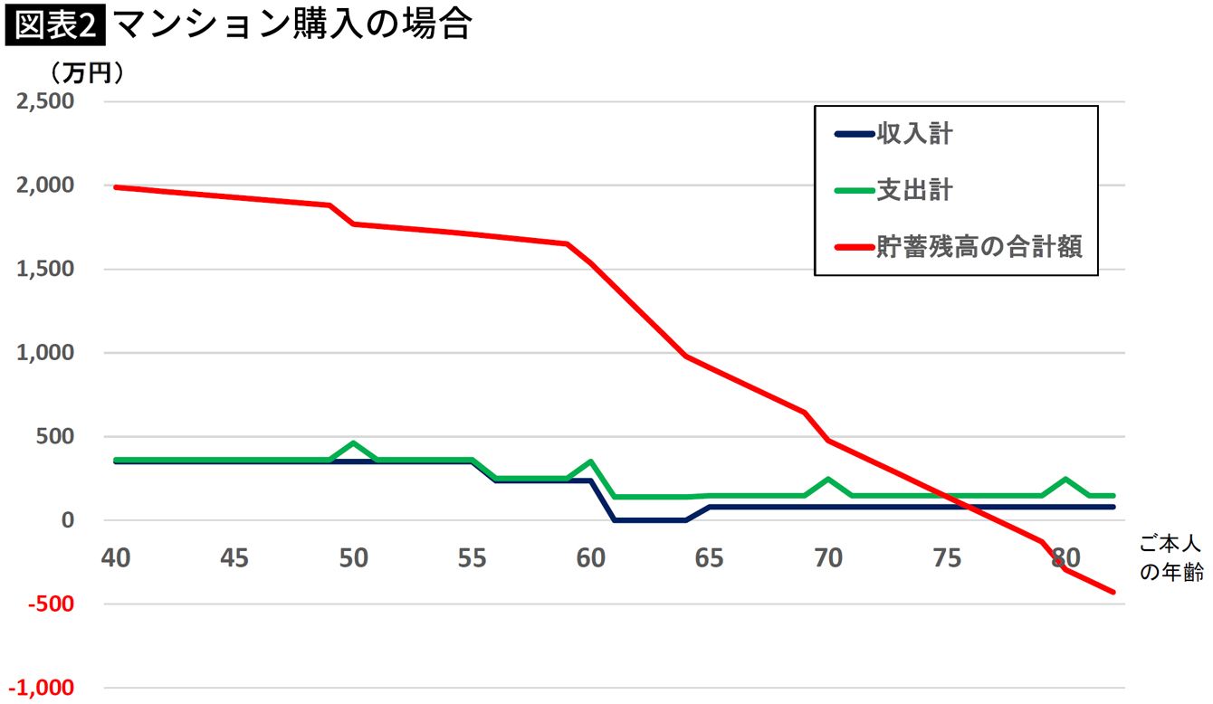 ※夫婦が戸建て住宅ではなく、同じ額の駅近のマンションを購入していた場合、住み替えの必要はなく(修繕費は定期的に払う)、長男が78歳のときに貯蓄が底を突く(同上)。
