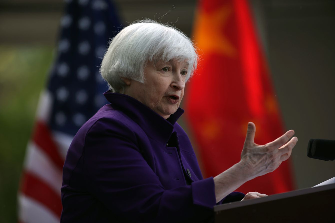 訪問先の中国・北京で記者会見するジャネット・イエレン米財務長官=2024年4月8日