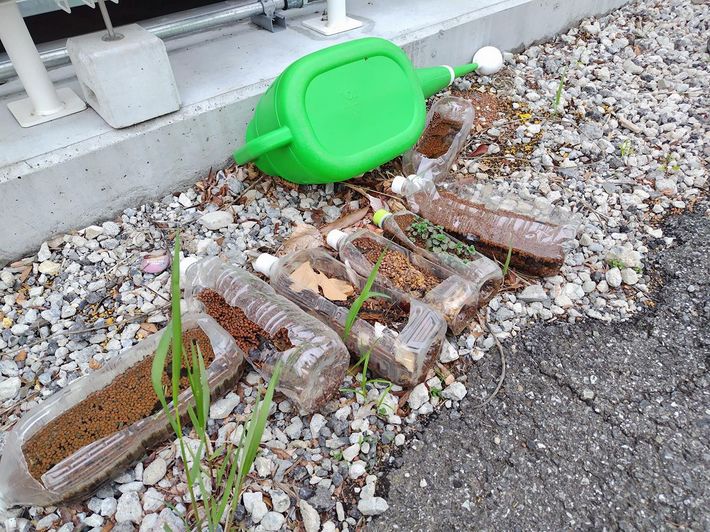 ペットボトルプランターでも食料生産。雑草に見えるが、一応クレソンが育っている