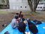 新歓鍋パーティー会場のブルーシートに、会の“常連”や新入生が集まってきた。写真を撮らせてほしいとお願いすると、いっせいに顔を隠す一同