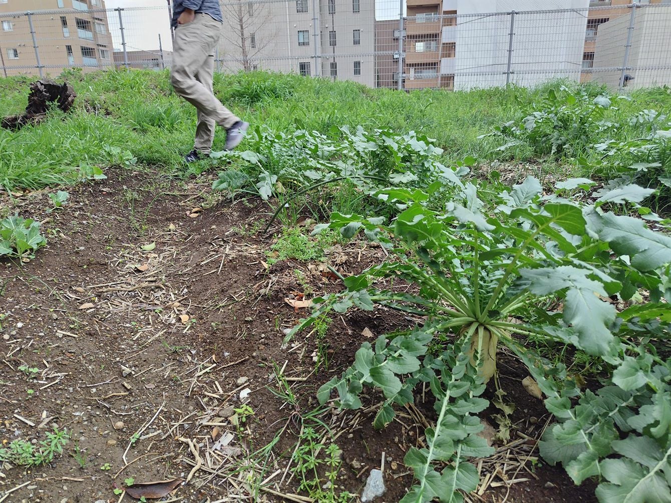 キャンパスの片隅に広がる大根畑。案内してくれた白川さんは、「トウが立ってきたから、そろそろ収穫しないといけないんですけど……」と、少しめんどくさそうにつぶやいた