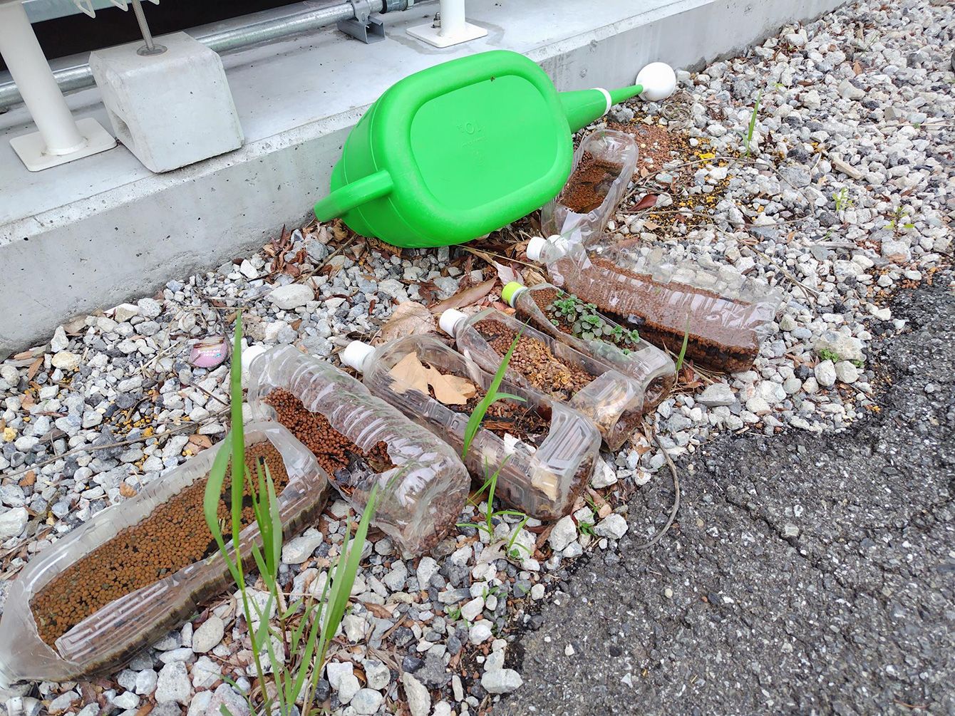 ペットボトルプランターでも食料生産。雑草に見えるが、一応クレソンが育っている