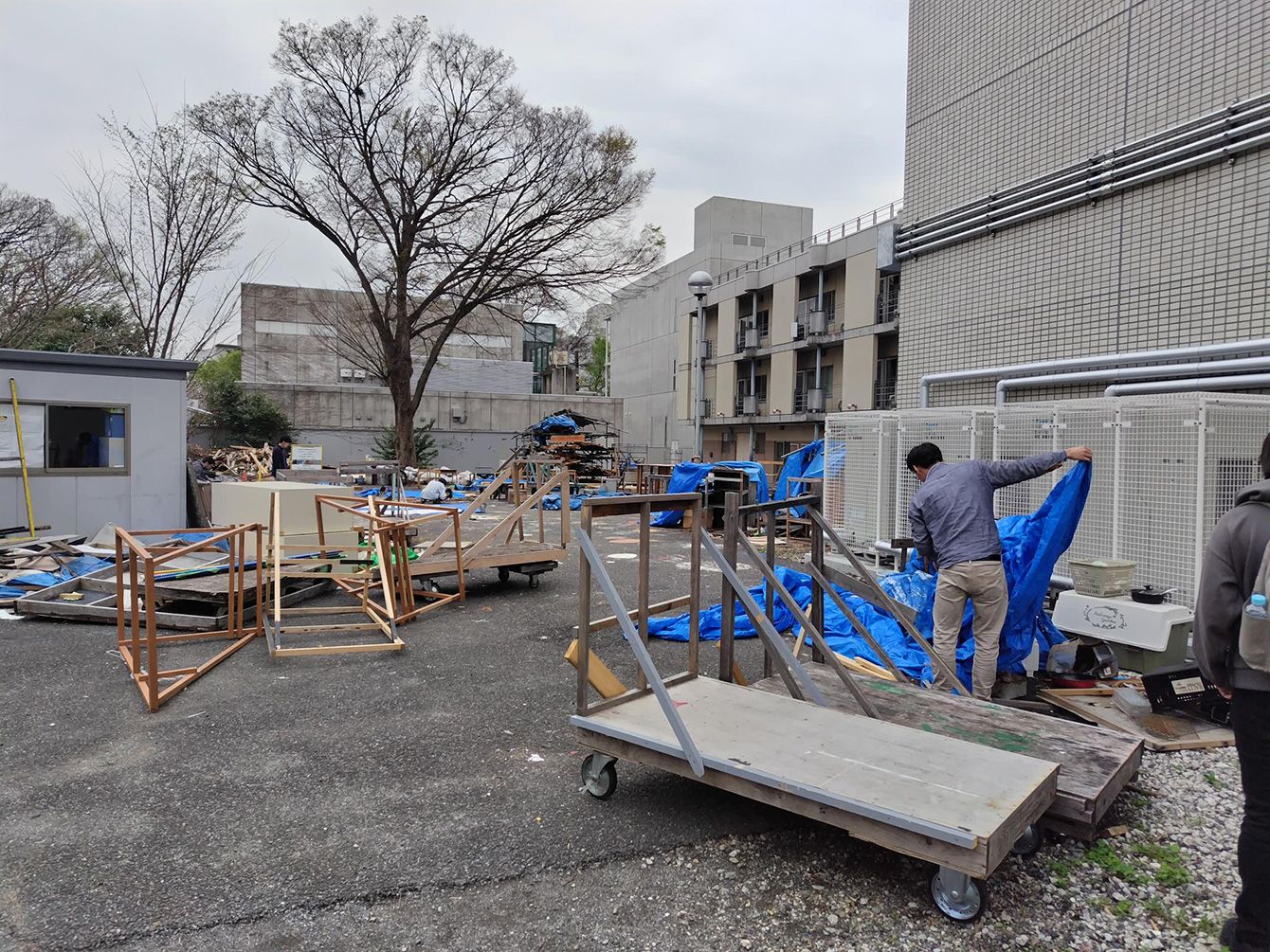 「ここには大学側も口を出してこない」(白川さん)という、キャンパス内の“治外法権エリア”。だめライフ愛好会には部室がないため、調理器具や工具などの持ち物はブルーシートをかぶせてここに置いている。鍋パーティーに使うIHヒーター2台のうち、1台は盗まれ、1台はコードを紛失したようで、白川さんは困り果てていた