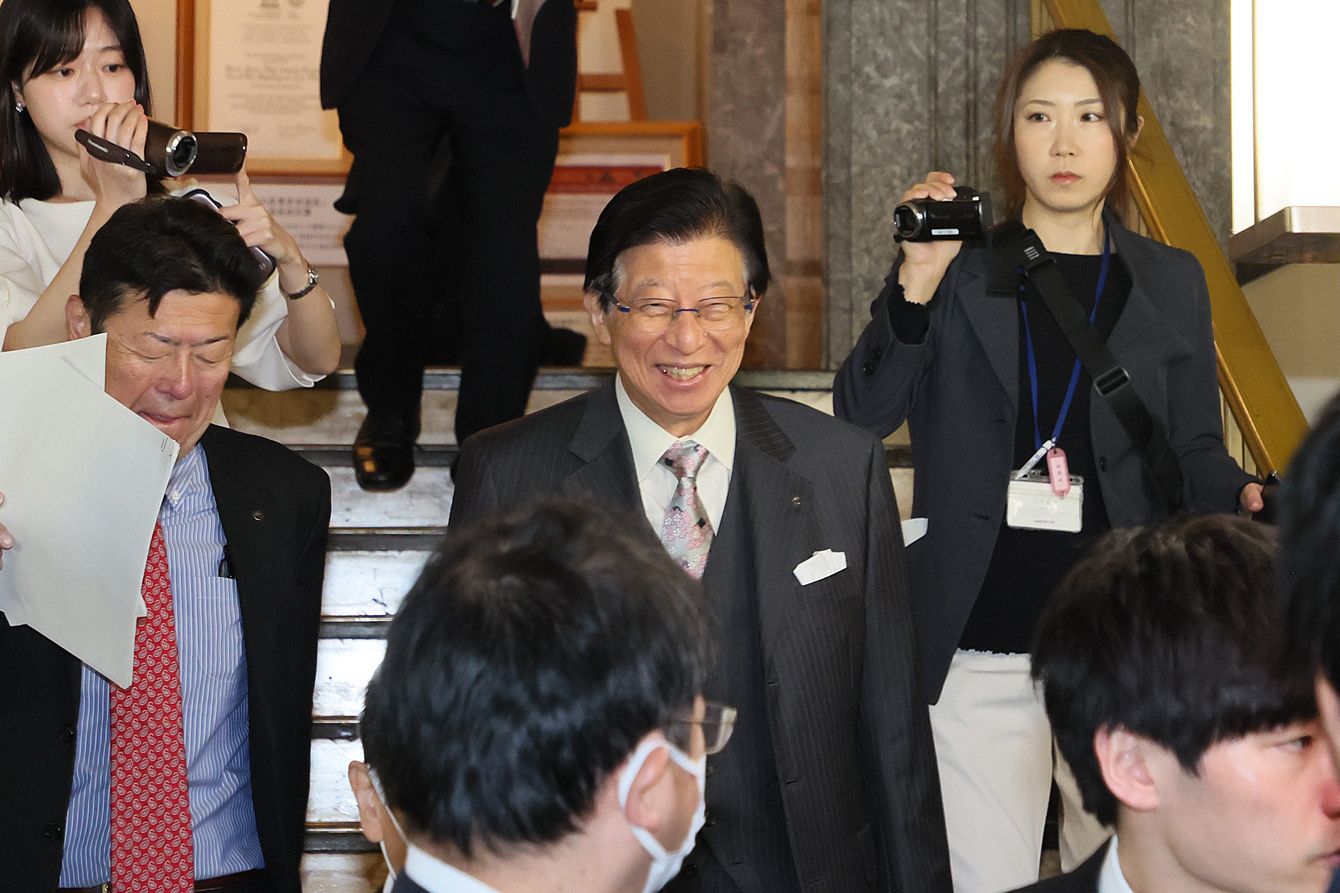 退職届を提出後、報道陣らに囲まれながら笑顔を見せる静岡県の川勝平太知事(中央)=2024年4月10日午前、静岡市
