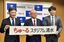 清水庵原球場の名称が「ちゅ~るスタジアム清水」に決まったことを発表する、命名権を取得したいなば食品の稲葉敦央社長(中央)ら=2024年1月18日、静岡市