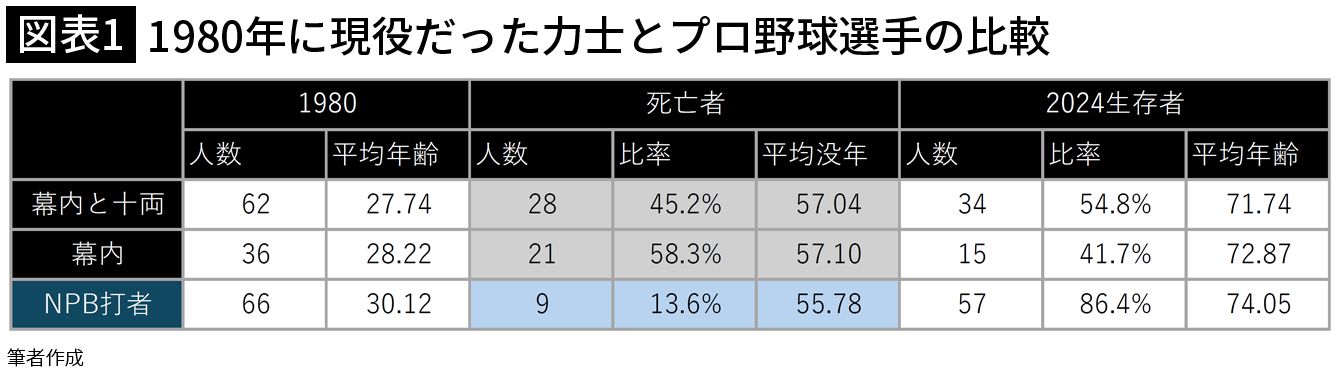 幕内と十両をあわせて計算しても、45%が既に死去している。