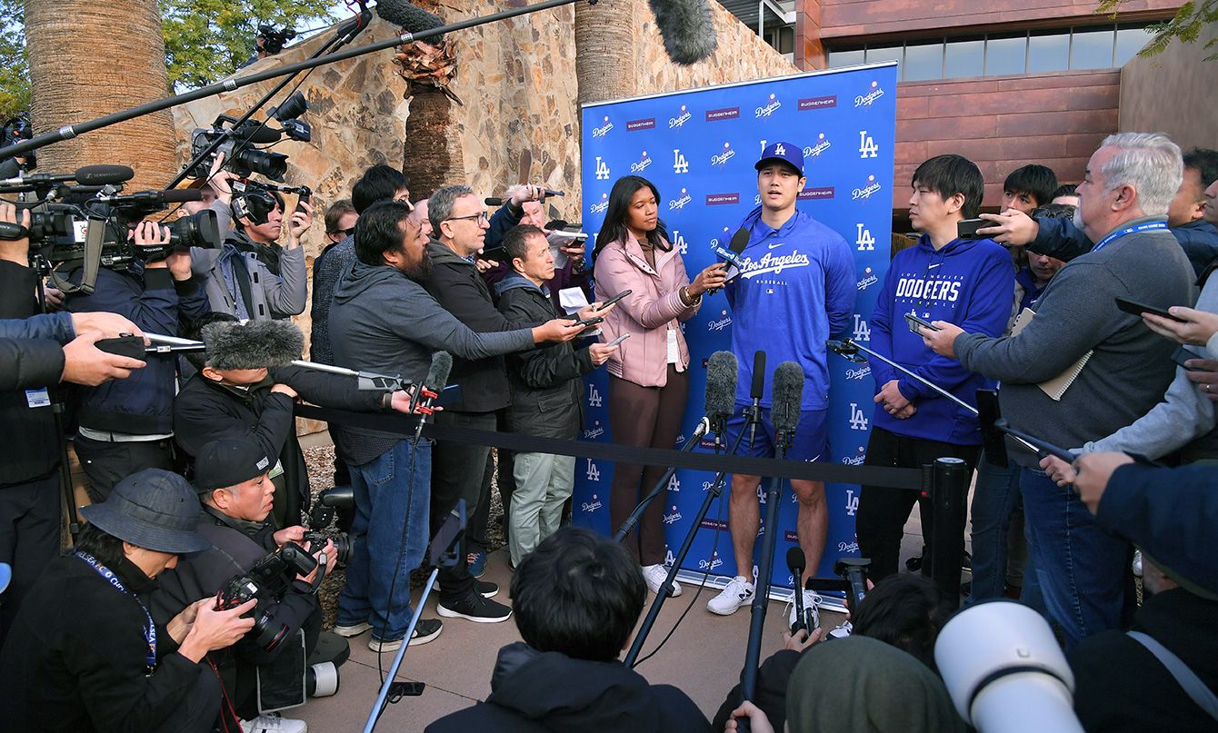 報道陣の取材に応じるドジャースの大谷翔平(中央)=2024年2月9日、アメリカ・アリゾナ州グレンデール